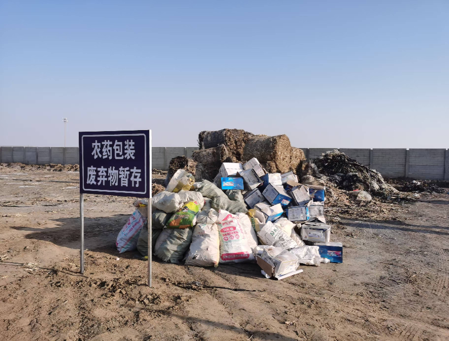 在农药包装废弃物及残留地膜的集中收集点,一个个带有地膜的废旧秸秆包被有序码放。旁边,一台废旧地膜处理设备正在运行中,工作人员将含有黑色塑料薄膜的葵花秸秆放置于进料口后,在高温热解处理后,废旧秸秆随后化为灰烬。