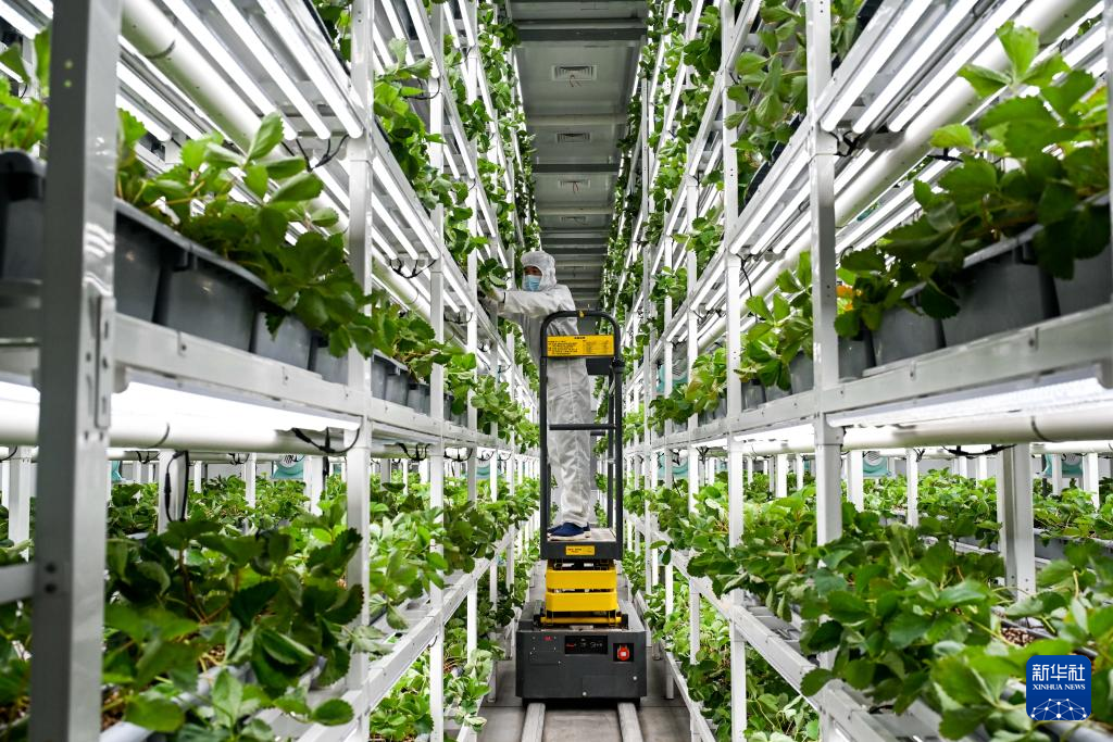 2月28日,在位于回民区的内蒙古宇生乐谷丰现代农业产业园的植物工厂,工作人员在管护草莓植株。