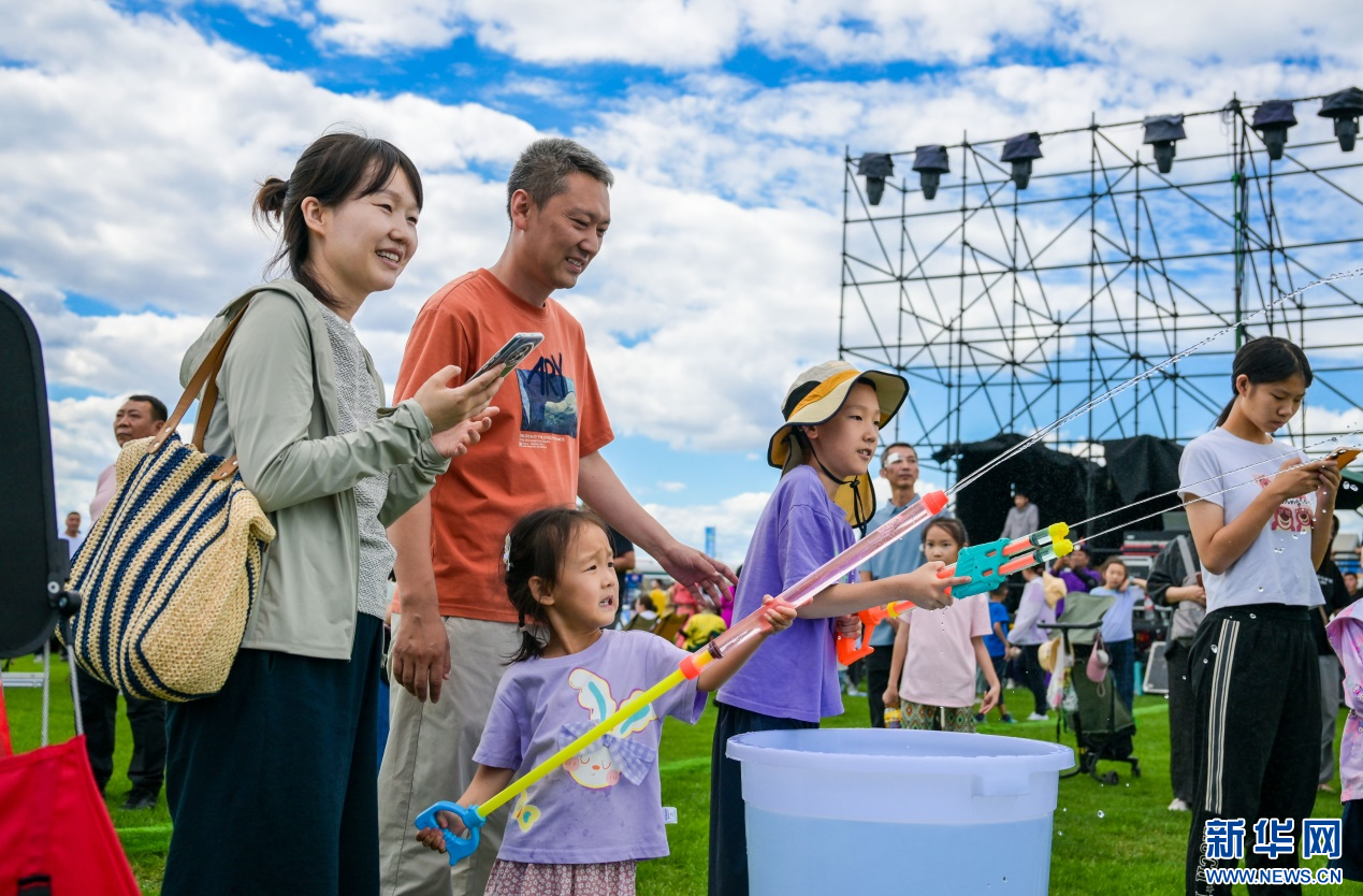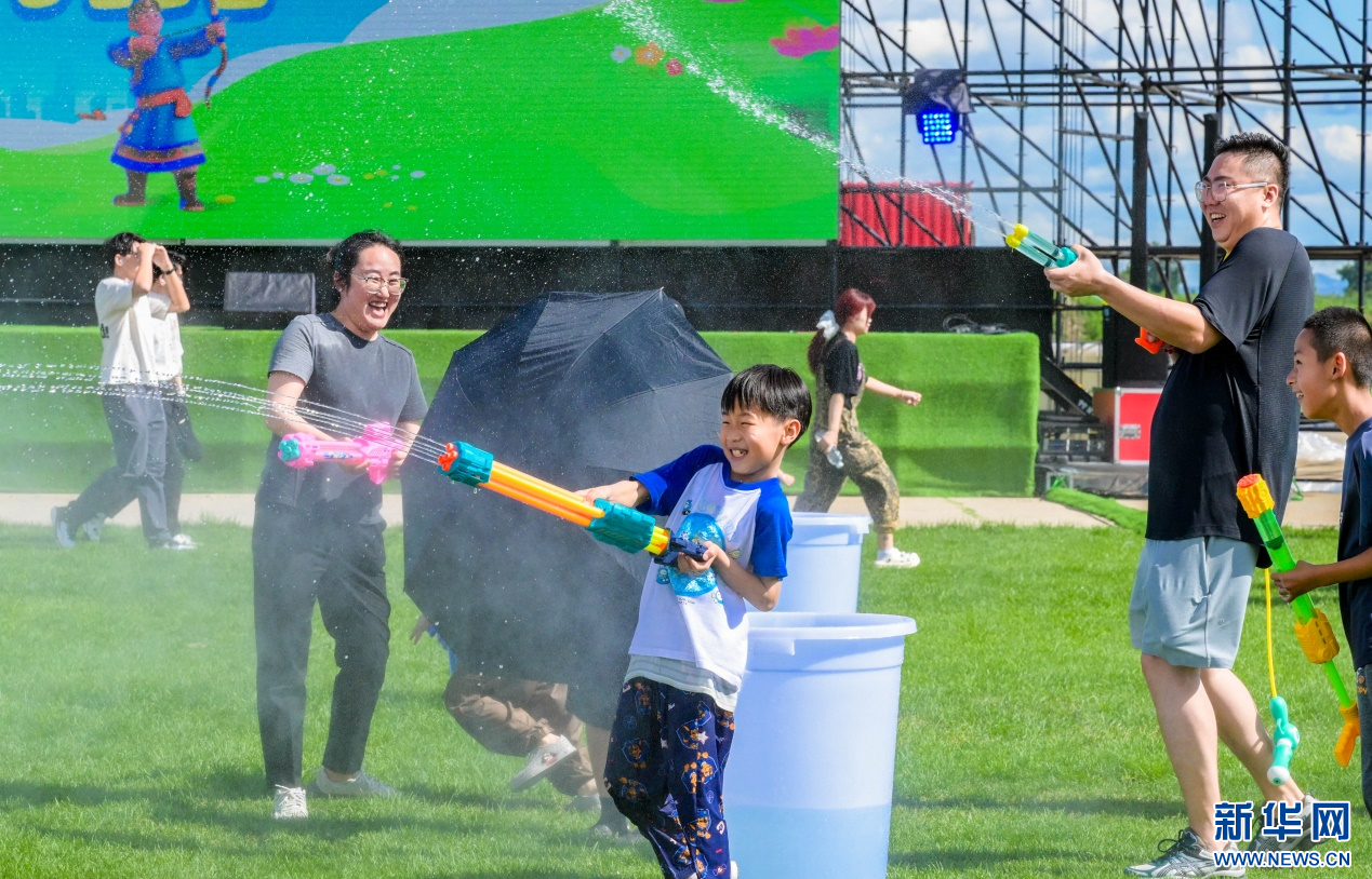 7月5日,游客在呼和浩特城市那达慕活动现场参加泡泡水枪大战项目。新华网发(丁根厚 摄)