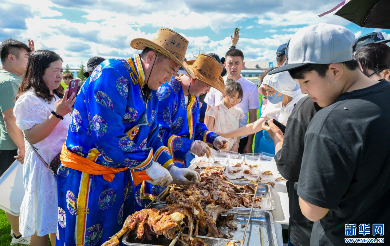 7月5日,工作人员在呼和浩特城市那达慕活动现场为游客分发烤全羊。新华网发(丁根厚 摄)