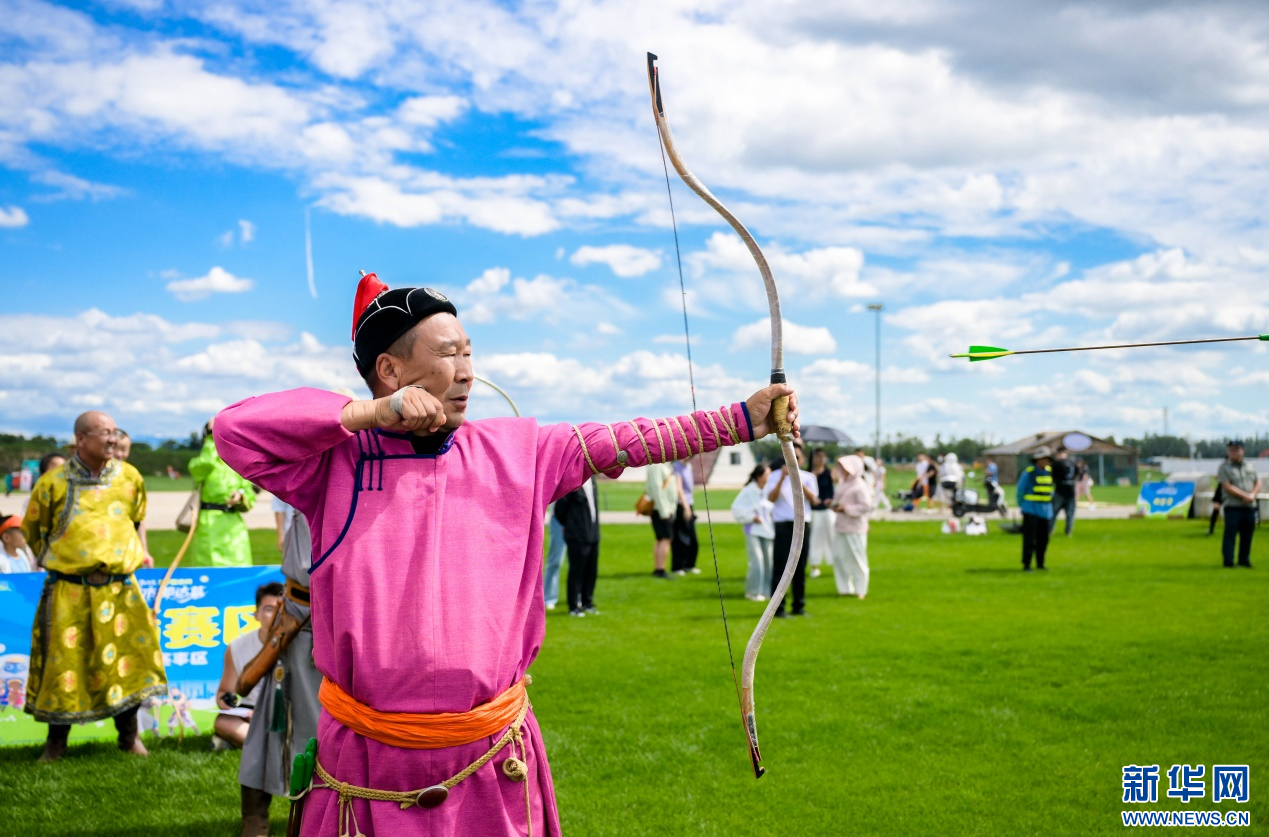 7月5日,游客在呼和浩特城市那达慕活动现场观看射箭比赛。新华网发(丁根厚 摄)