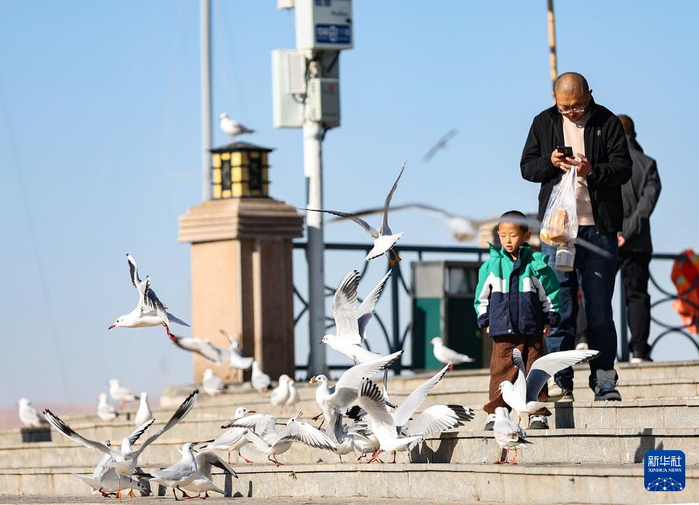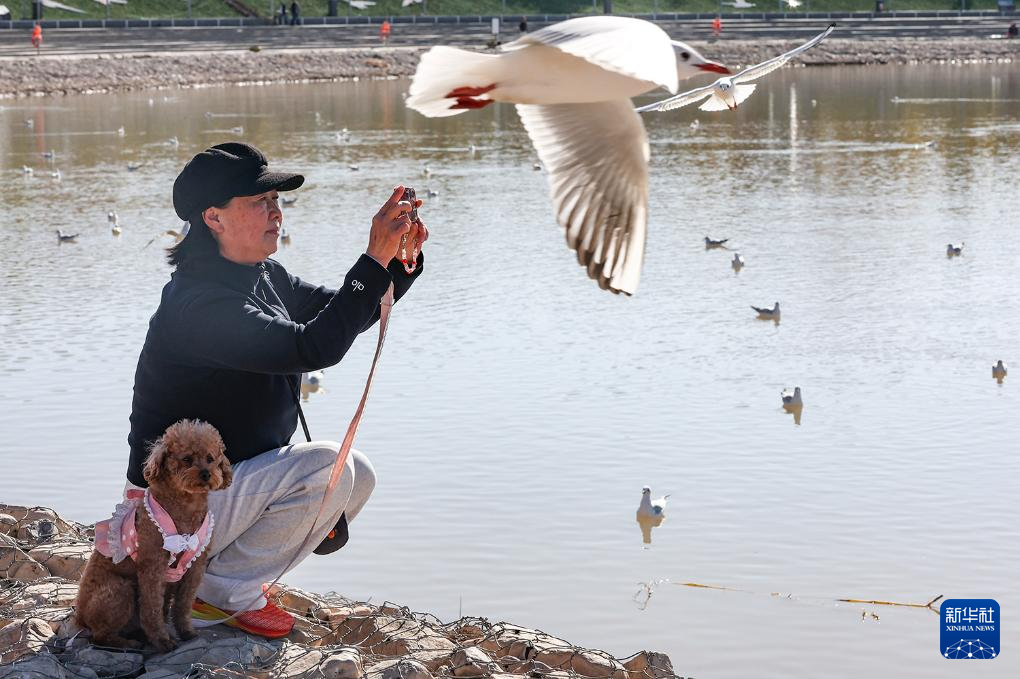 深秋时节,大批南飞越冬的红嘴鸥在内蒙古乌海市境内的乌海湖驻足觅食、栖息,引来众多市民游客前来观赏并与之互动,绘就人鸥同乐的靓丽风景。近年来,随着乌海湖及周边生态环境持续向好,途经这里的候鸟数量和种类逐年增加。(康文魁 摄影报道)