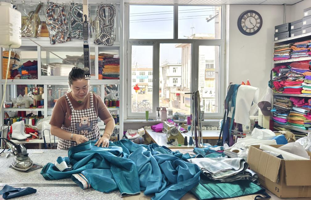 11月15日,巴林民族手工坊大楼里,一位缝纫师正在熨烫服装。(新华网 杨腾格尔 摄)