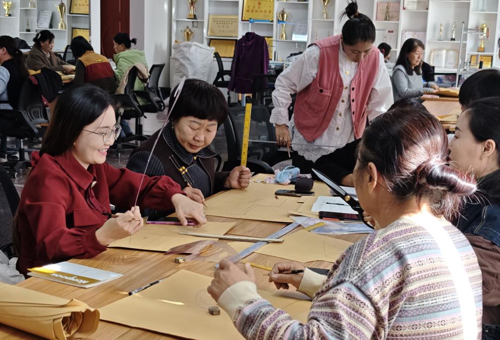 11月15日,在巴林右旗2025年乡村工匠培训工程项目培训班上,学员们在讨论服装裁剪技术。 新华社记者 贾立君 摄