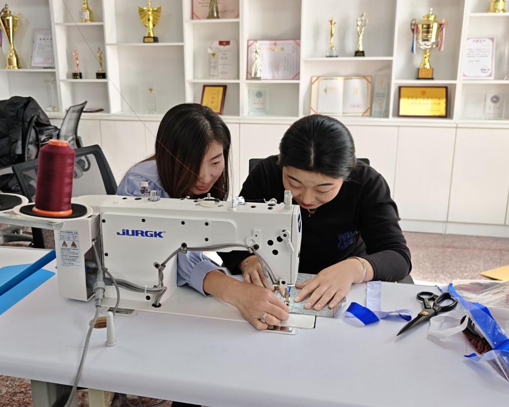 11月15日,在巴林右旗2025年乡村工匠培训工程项目培训班上,一位老师手把手教学员缝纫技术。 新华社记者 贾立君 摄