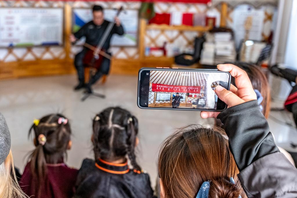 11月13日,在苏尼特右旗第五小学,乌云吉日嘎拉在指导“小小乌兰牧骑”的队员演奏马头琴。
