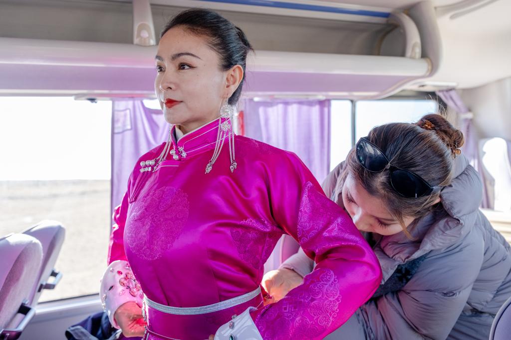 11月12日,乌云吉日嘎拉在大巴车上向其他演员演示乐器弹奏技巧。