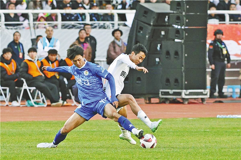 2025年伊利内蒙古自治区足球超级联赛中,呼和浩特与通辽队员争抢。