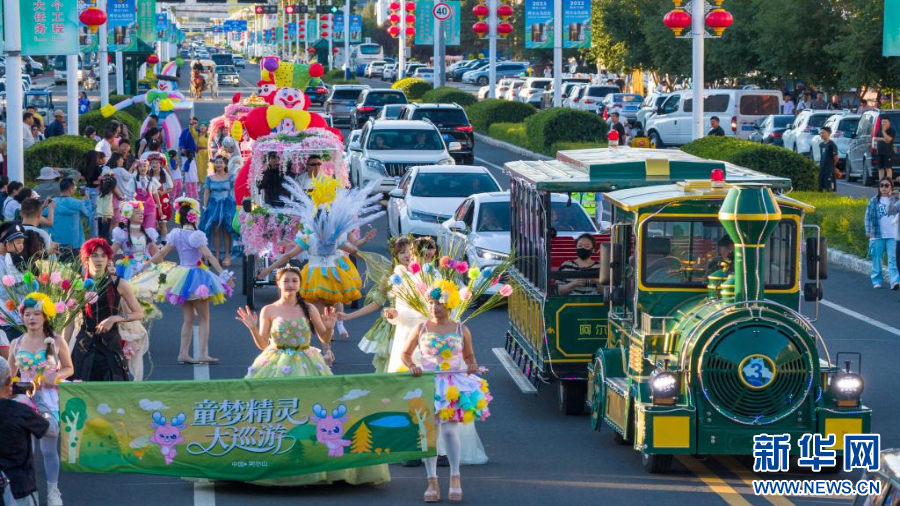 这是在阿尔山市街头拍摄的花车巡游车队和观光小火车(拍摄于2025年7月27日)。新华社记者 马金瑞 摄