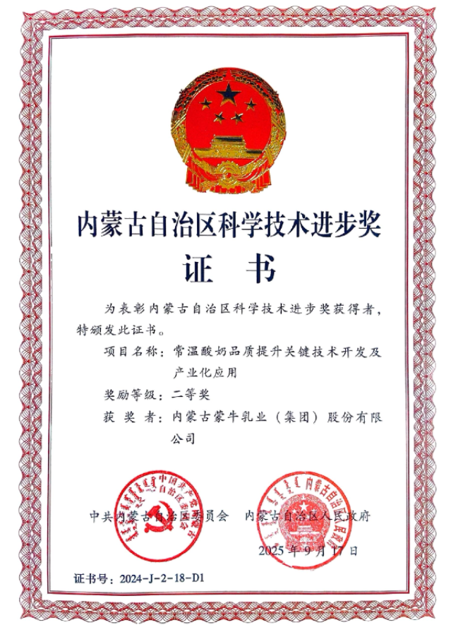近日,内蒙古自治区科学技术奖励大会在呼和浩特召开,会上表彰了为全区科技进步和高质量发展作出突出贡献的科技工作者、科研团队。蒙牛集团两项科研成果凭借在行业技术创新和产业化应用中的突出贡献,荣获自治区科技进步和技术发明二等奖。