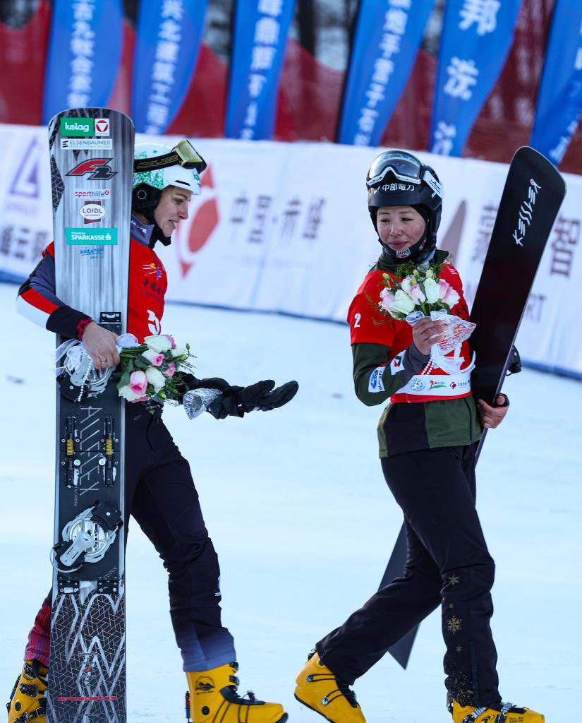 12月7日,冠军日本选手三木椿(右)与季军奥地利选手萨比娜·派尔在颁奖仪式后进行交流。