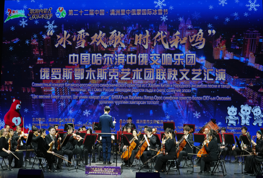 12月19日晚,内蒙古满洲里市乌兰牧骑剧场内乐声悠扬、舞姿翩跹,“冰雪欢歌时代和鸣”中国哈尔滨中俄交响乐团、俄罗斯鄂木斯克艺术团联袂文艺汇演在此精彩上演。作为第二十二届中国·满洲里中俄蒙国际冰雪节的重要文化活动,本次演出由满洲里市人民政府主办、市文体旅游广电局承办,为现场观众呈现了一场跨越国界的艺术交流盛宴。
