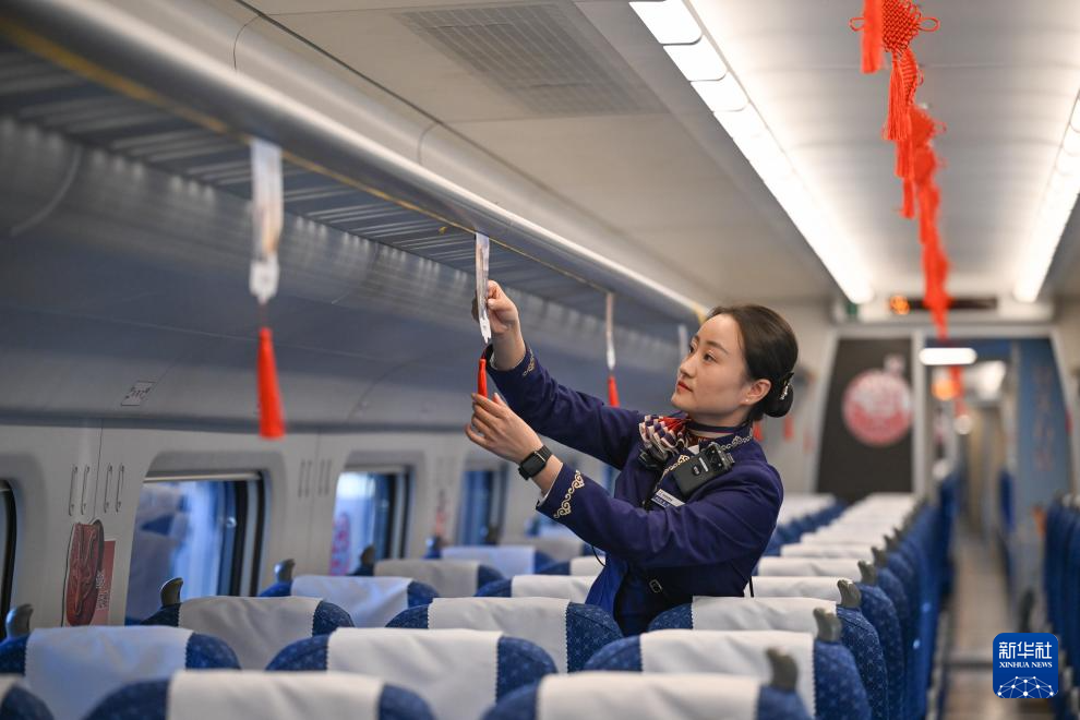 12月23日,列车员在即将由包头站发车的D4667次动车组列车上布置车厢。