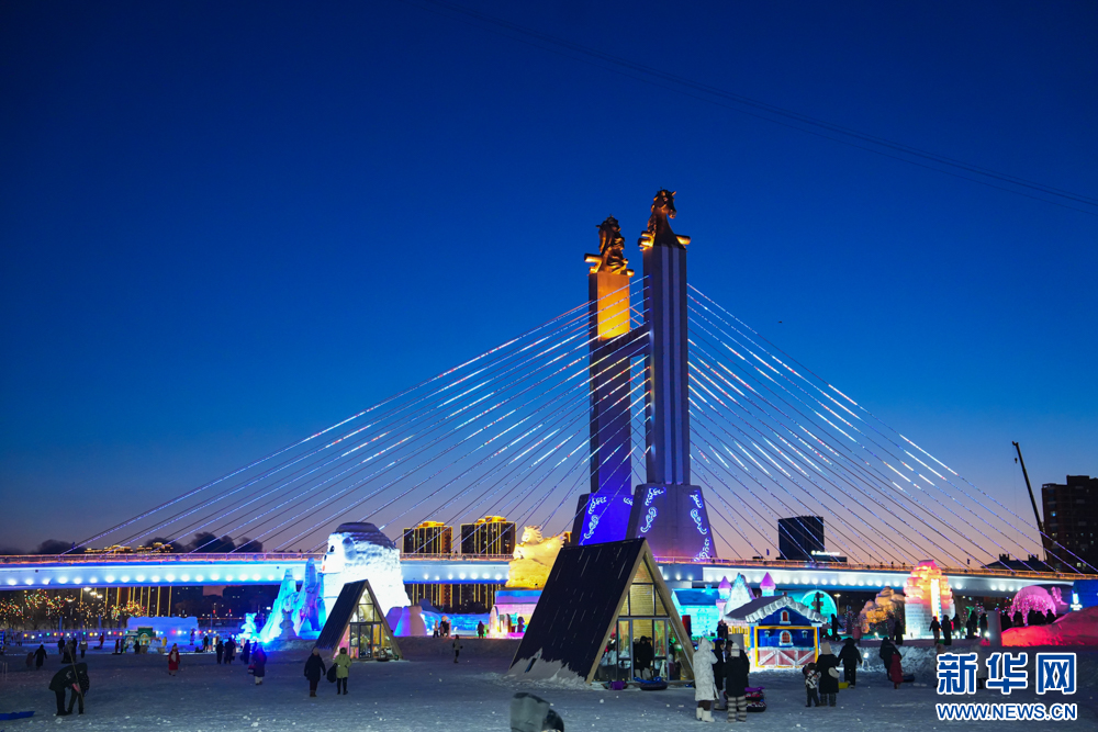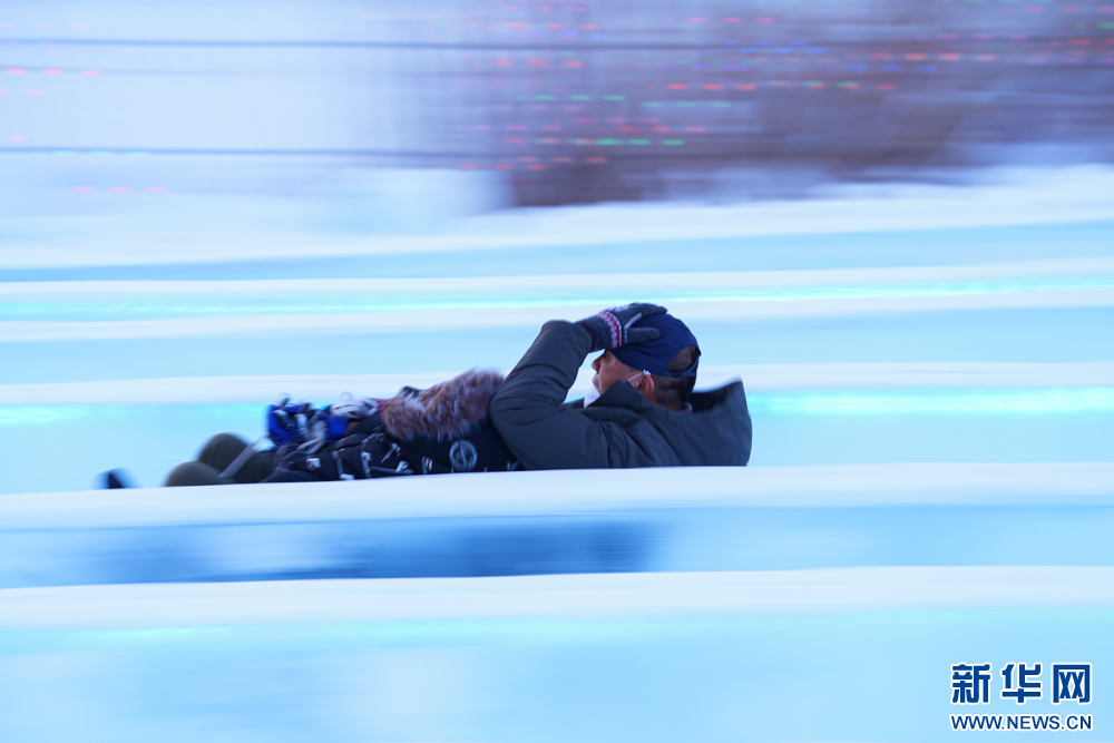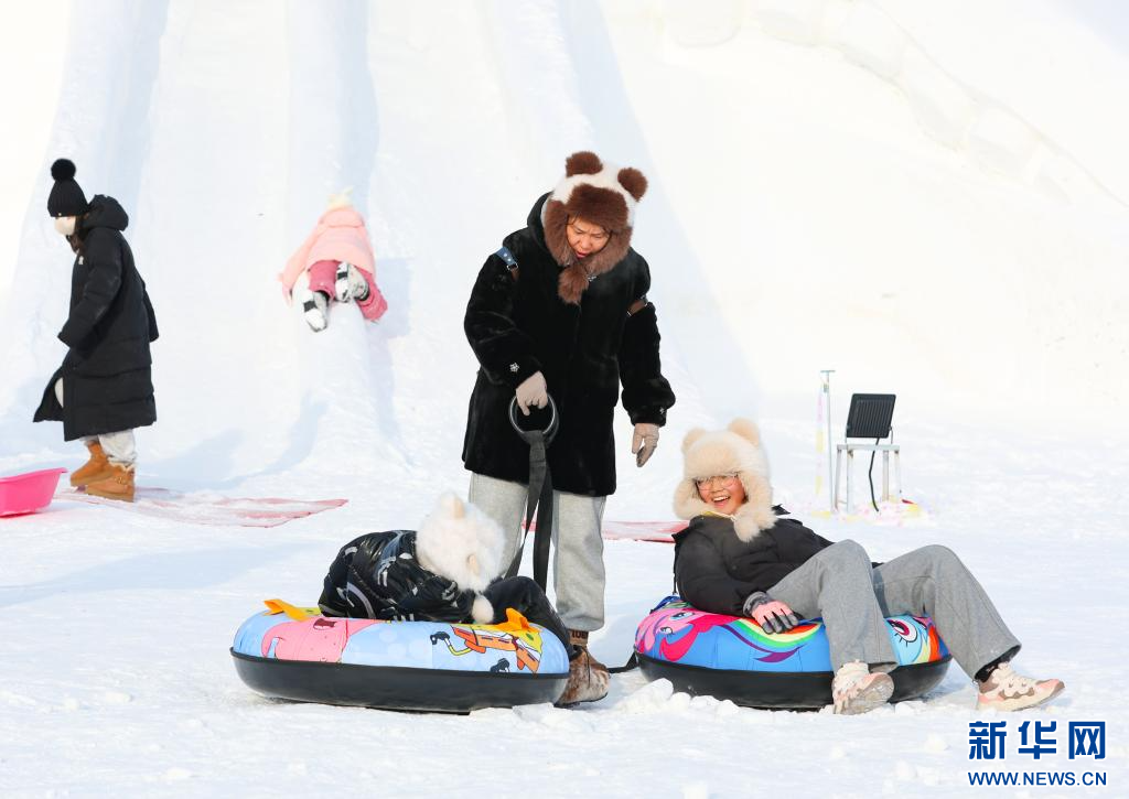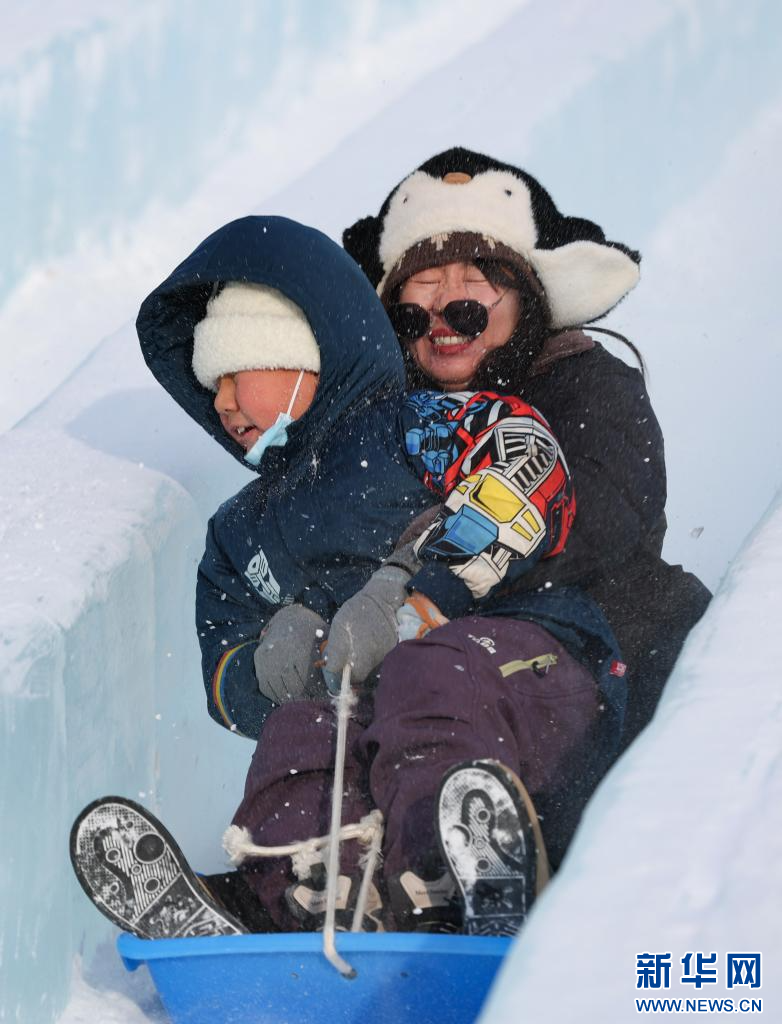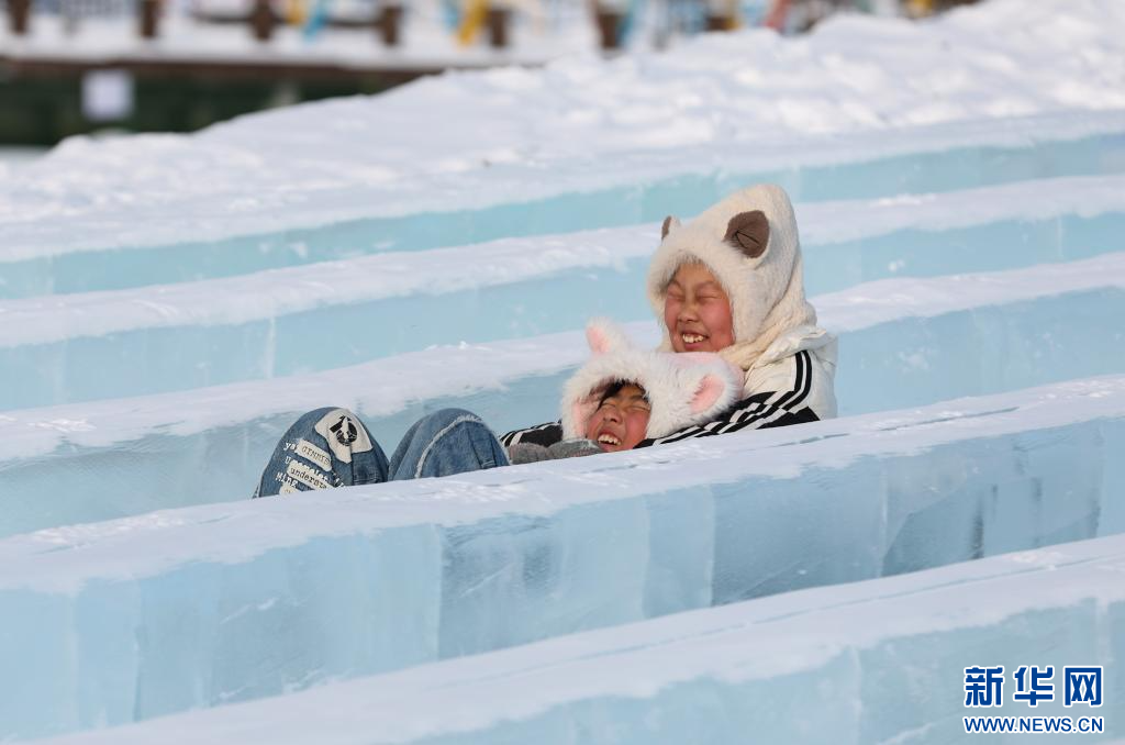12月20日,游客在“绒绒雪世界”体验冰滑梯。新华网发(康文魁 摄)