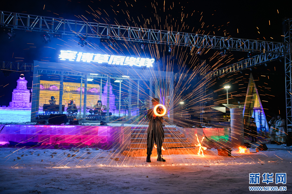 12月20日,艺人在“绒绒雪世界”表演火壶秀。新华网发(张健 摄)