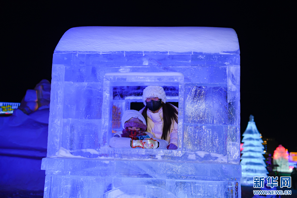 12月20日,游客在“绒绒雪世界”彩色冰雕作品前拍照。新华网发(康文魁 摄)