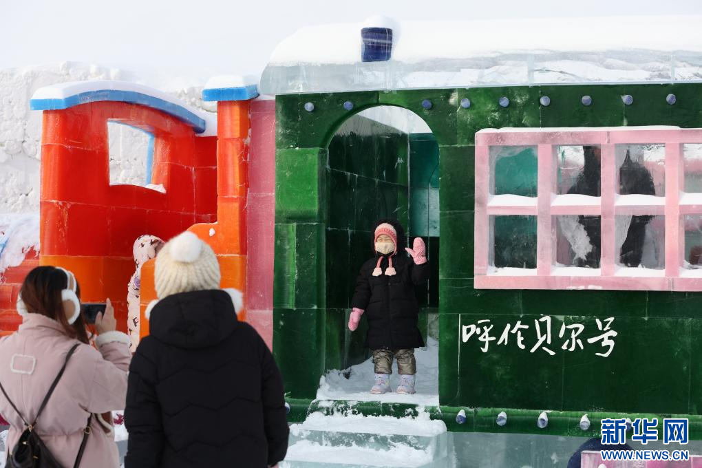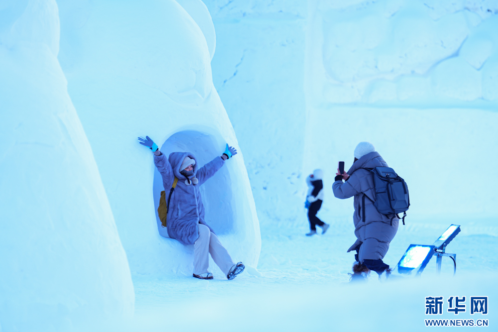 12月20日,游客在“绒绒雪世界”冰雕作品前拍照。新华网发(张健 摄)