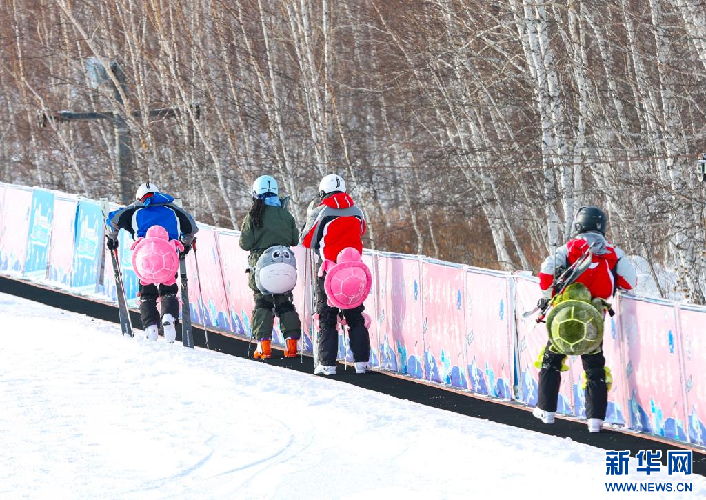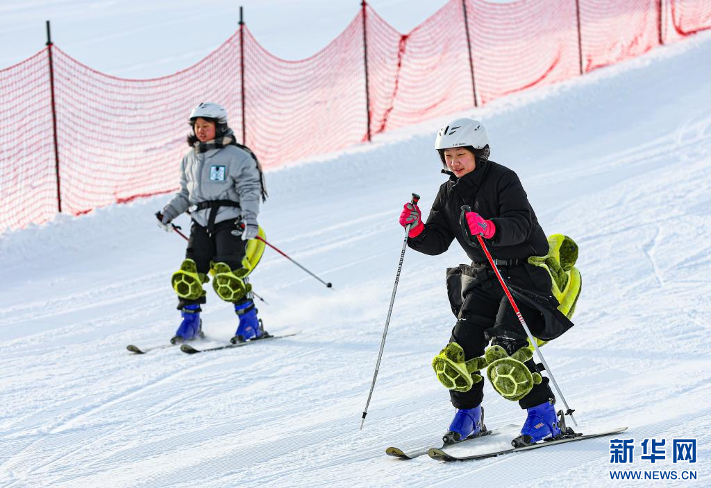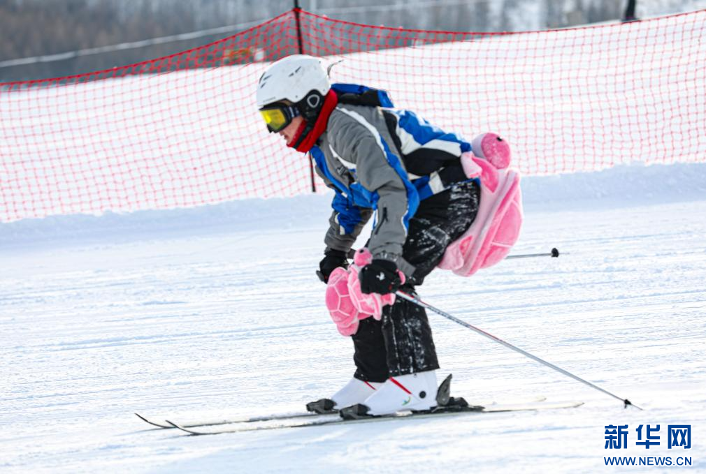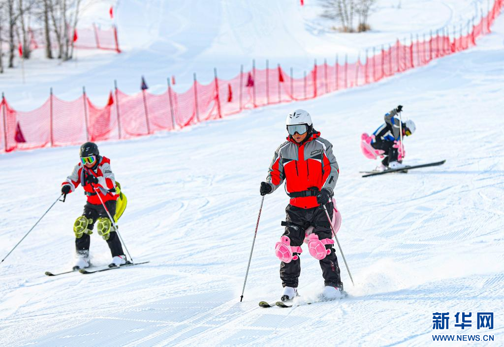 12月22日,3名来自四川的游客在凤凰山滑雪场滑雪。新华网发(康文魁 摄)