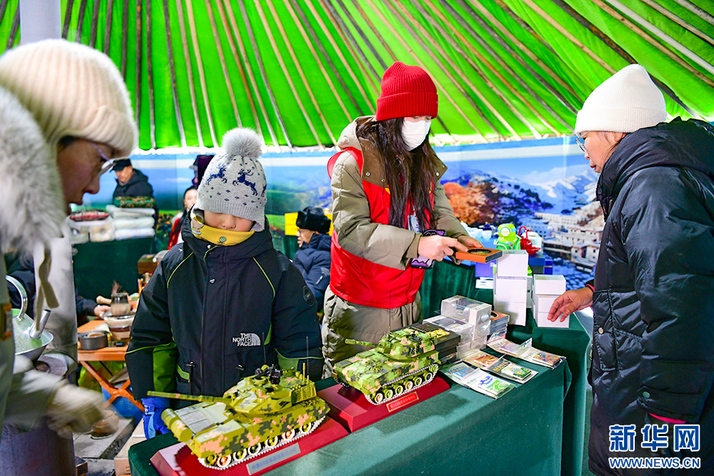莫力达瓦达斡尔族自治旗——展销以莫力达瓦字体冰箱贴为代表的非遗文创,以及野生榛子、菇娘果汁、奶制品等农副产品,现场提供姜茶、奶茶并免费发放暖贴。