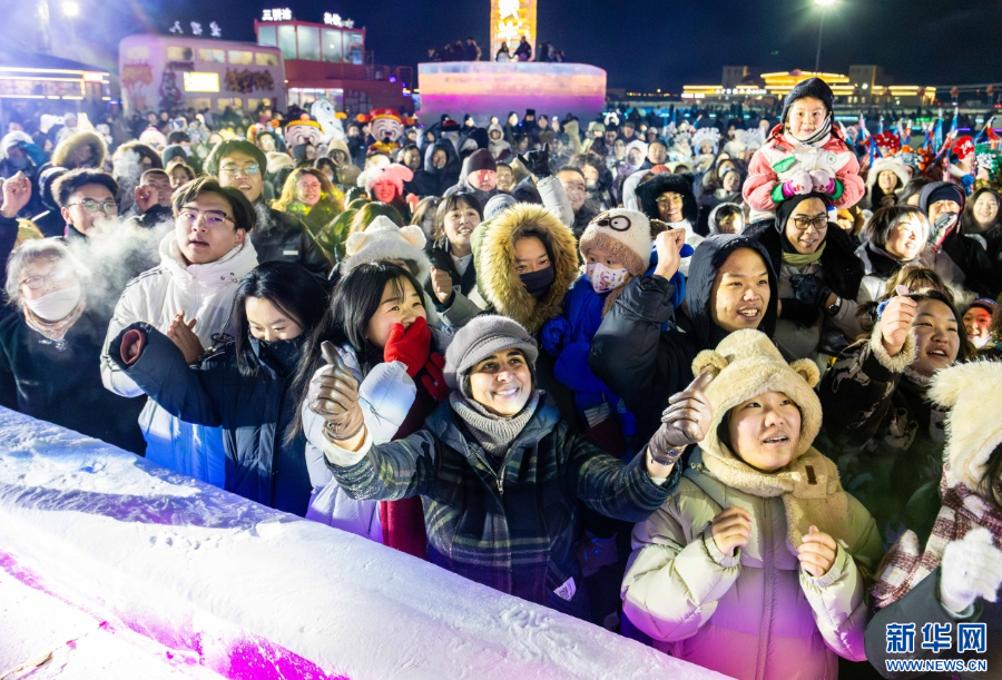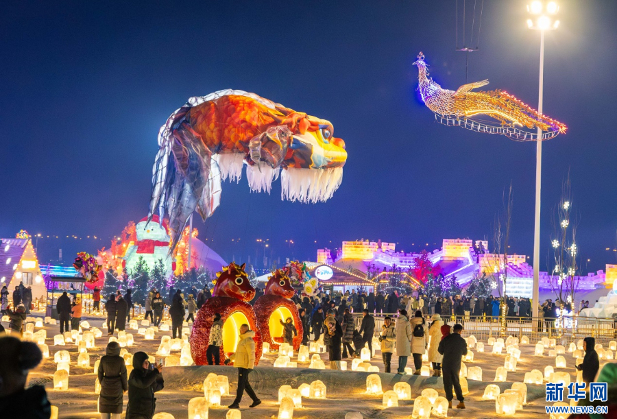 2025年12月31日,游客在第五届呼和浩特欢乐冰雪节活动现场观看“飞天鳌鱼”“凤舞九天”表演。新华网发(丁根厚 摄)