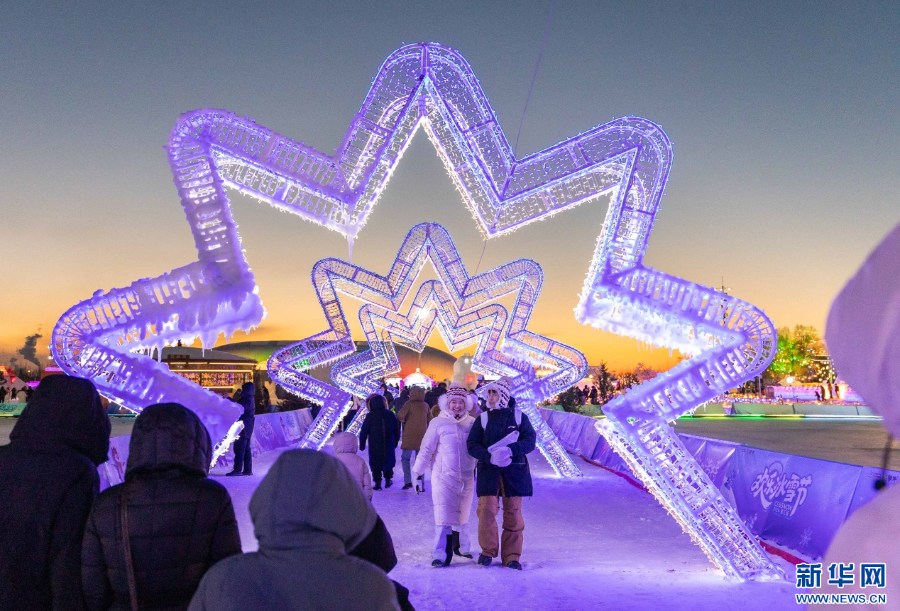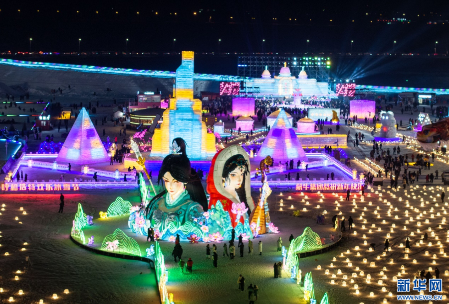 2025年12月31日,游客在第五届呼和浩特欢乐冰雪节园区游玩赏景。新华网发(丁根厚 摄)