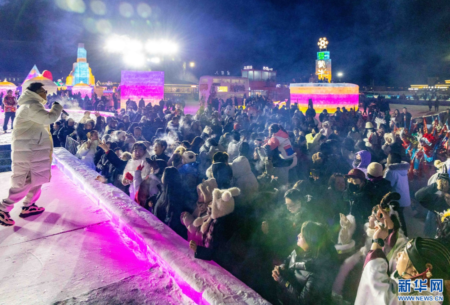 2025年12月31日,游客在第五届呼和浩特欢乐冰雪节活动现场与歌手互动。新华网发(丁根厚 摄)