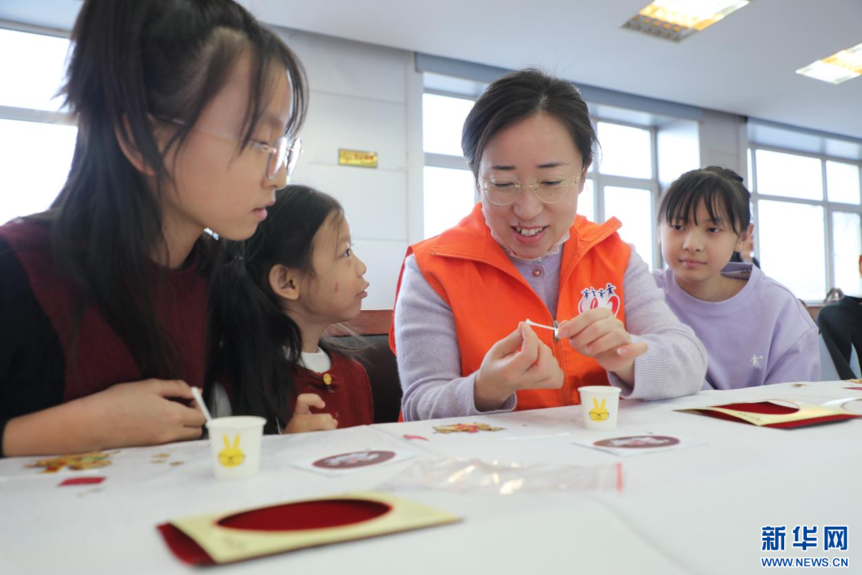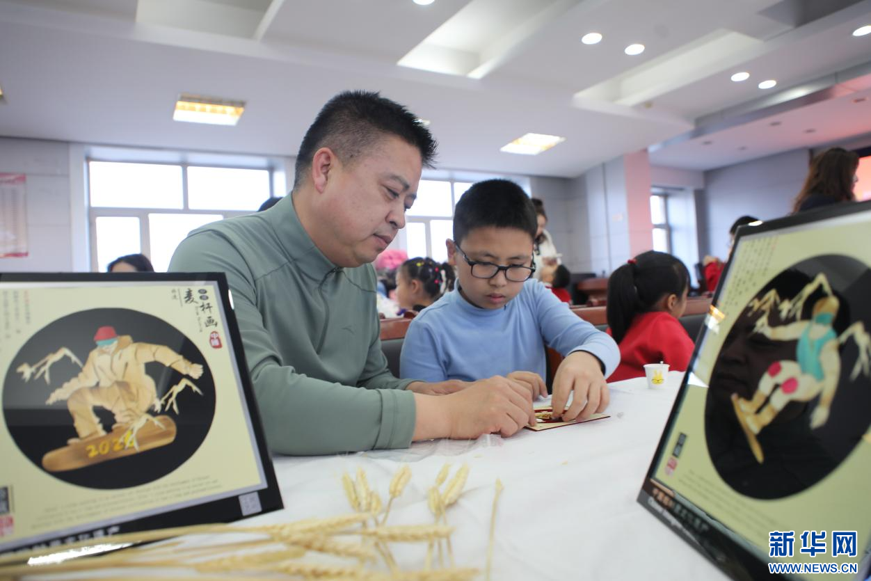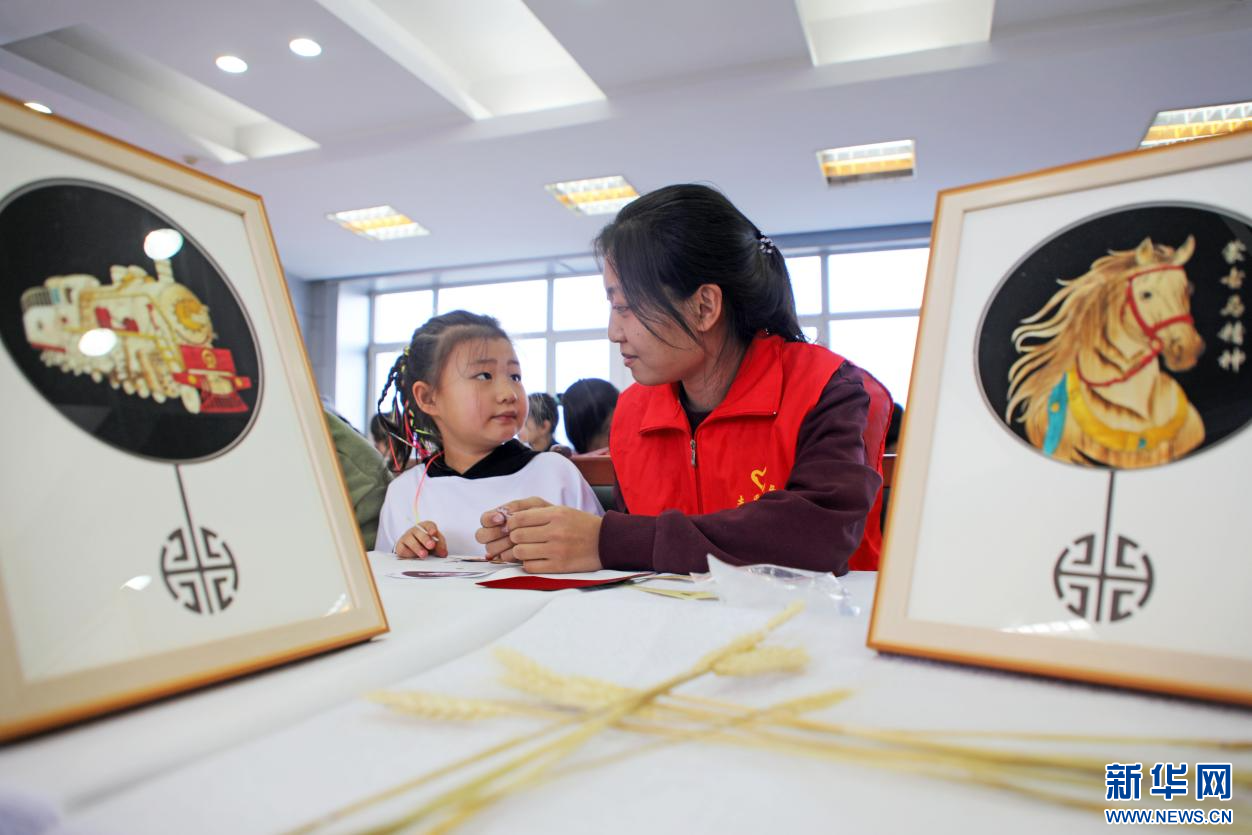 1月26日,在内蒙古自治区扎兰屯市正阳街道永安社区,小朋友在志愿者指导下制作麦秆画。新华网发 (韩颖群 摄)