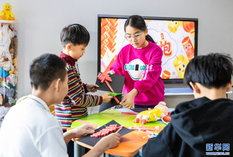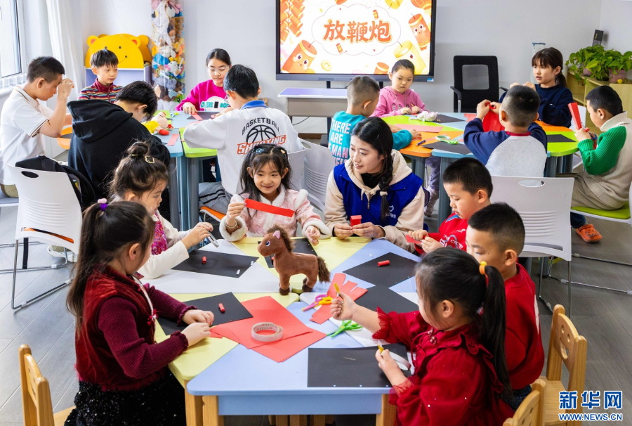 1月26日,在呼和浩特市玉泉区秋实社区,集中托管的学生在青年志愿者指导下做手工。新华网发(丁根厚 摄)