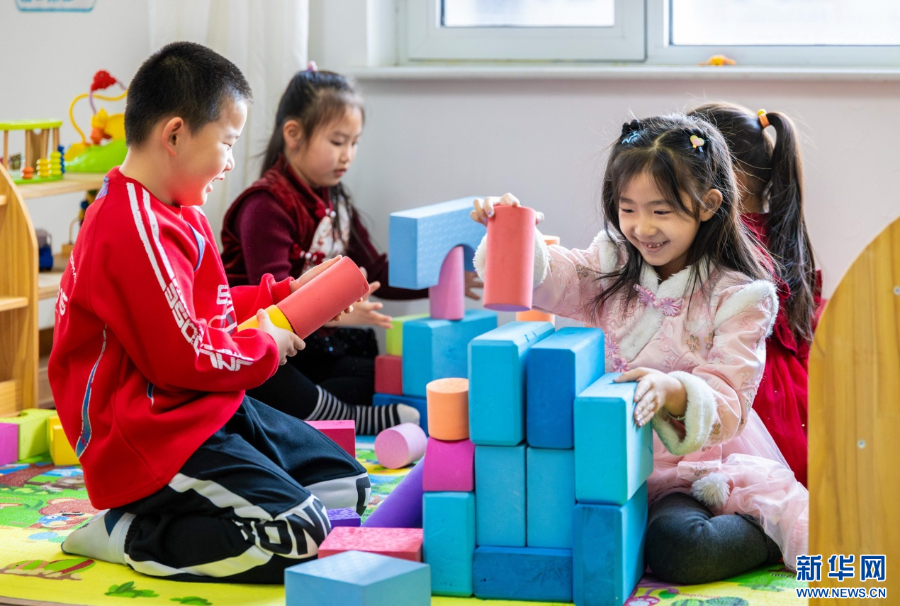 1月26日,在呼和浩特市玉泉区秋实社区,集中托管的学生在玩积木。新华网发(丁根厚 摄)