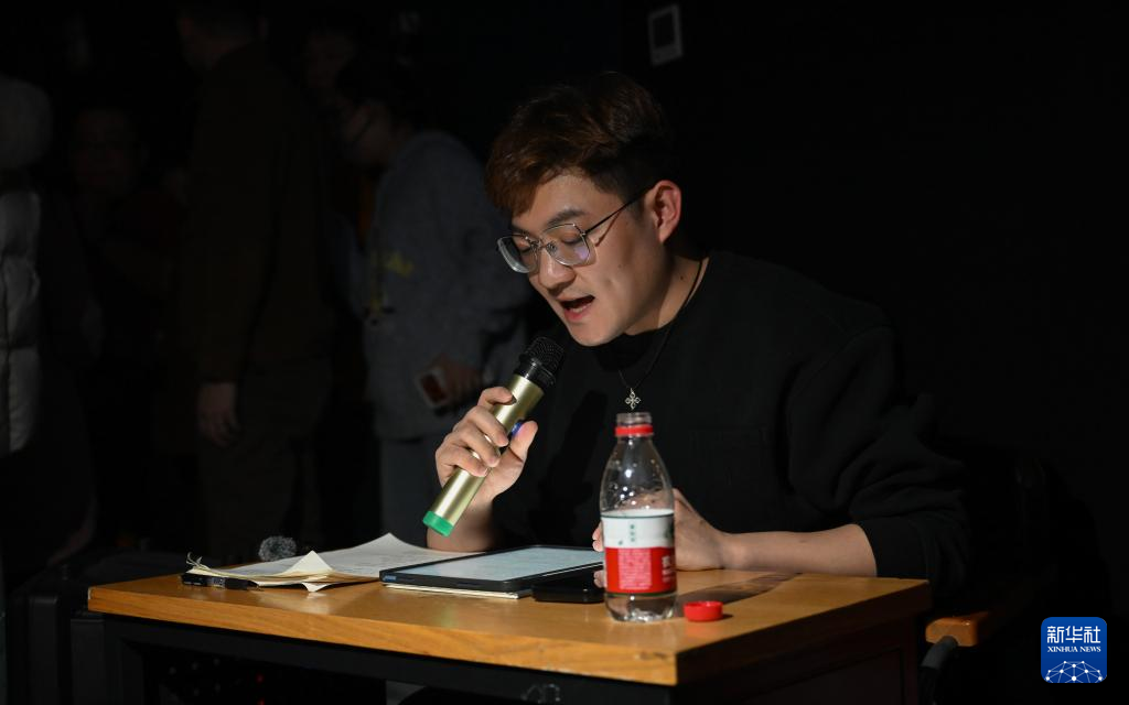 1月27日,中国盲文出版社编辑钱博宇在影院内为观众解说影片内容。