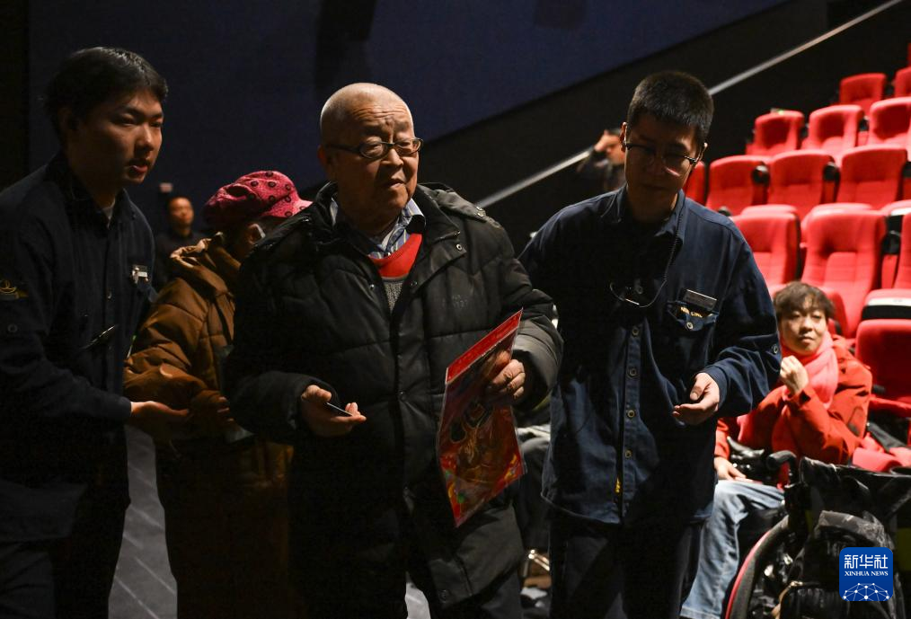 1月27日,工作人员(前右)协助残障人士进入影院。