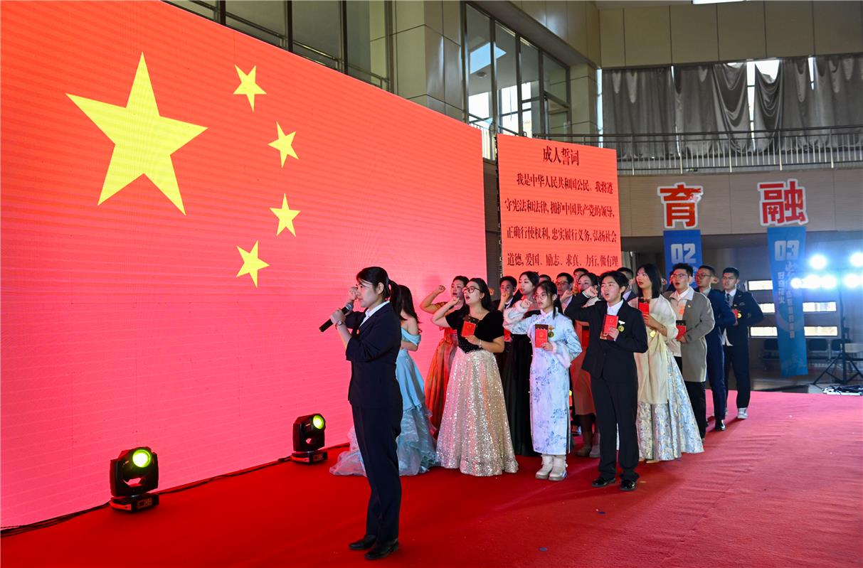 活动上,往届优秀校友分享成长经验,校领导为学子颁发徽章与卡片等纪念品,寓意肩负责任、逐梦前行。在庄严宣誓中,学子们高举右拳,誓言铿锵,宣告正式迈入成年。