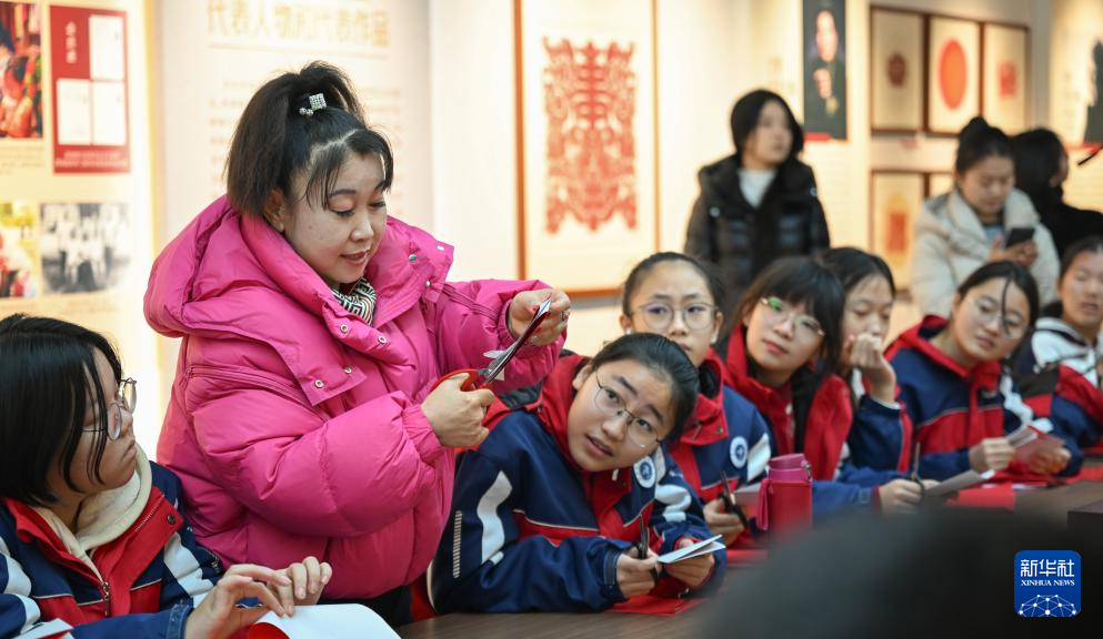 2月4日,和林格尔剪纸国家级非物质文化遗产代表性传承人段建珺(前右二)向学生介绍和林格尔剪纸。新华社记者 贝赫 摄