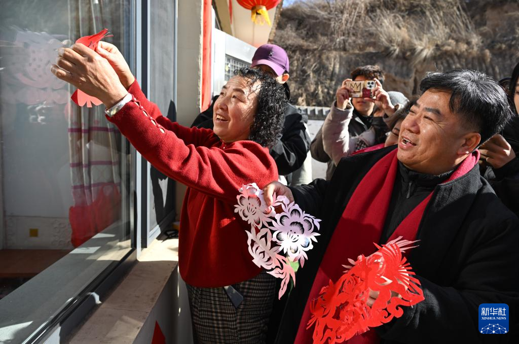 2月4日,在内蒙古呼和浩特市和林格尔县台格斗村,和林格尔剪纸国家级非物质文化遗产代表性传承人段建珺(前右)和村民一起贴窗花。新华社记者 贝赫 摄