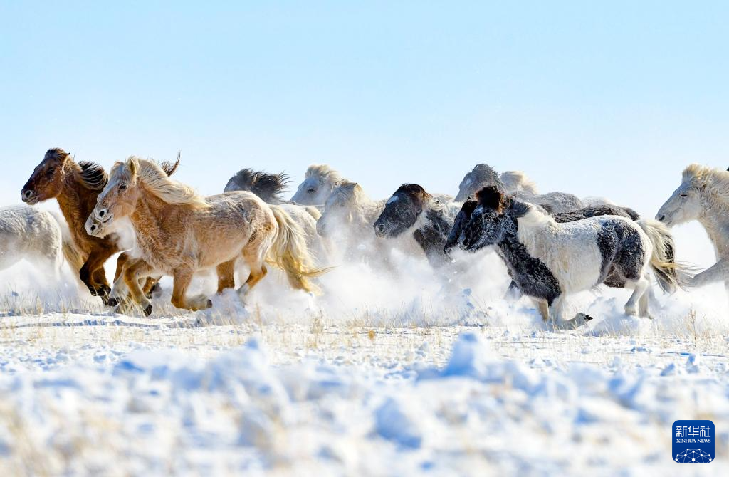 2月5日,马群在凤凰马场的雪原上奔驰。