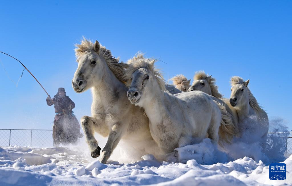2月5日,牧民在凤凰马场的雪原上驯马。