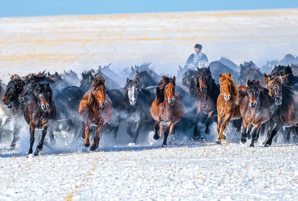 在辽阔牧场上,一群群蒙古马风驰电掣,成为内蒙古冬季草原的一道道“风景线”。
