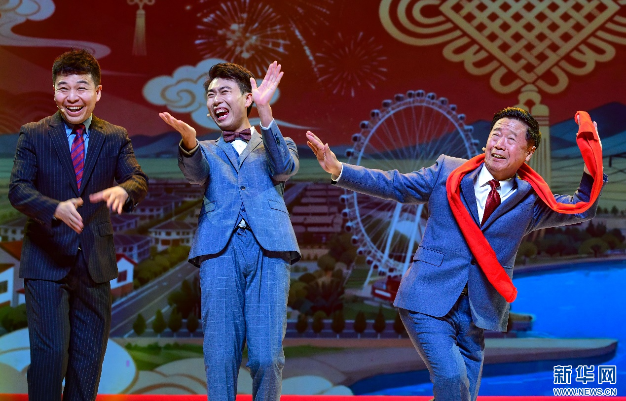 2月11日,演员在内蒙古曲艺春晚上表演群口相声《欢迎您到内蒙古来》。新华网发(王正 摄)