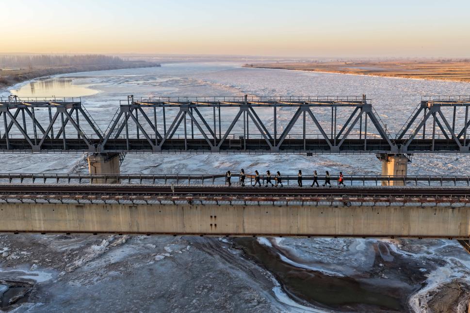 包兰铁路三盛公黄河铁路特大桥与包银高铁磴口黄河特大桥是中国铁路呼和浩特局集团有限公司乌海工务段管内的铁路桥。春运期间,为保障列车安全平稳运行,乌海工务段的桥隧工人加强了这两座大桥的巡检工作。