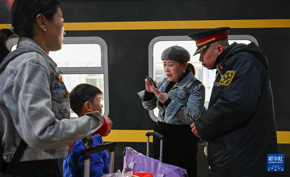 2月15日,列车长刘建青(右一)在西安站为旅客解答问题。