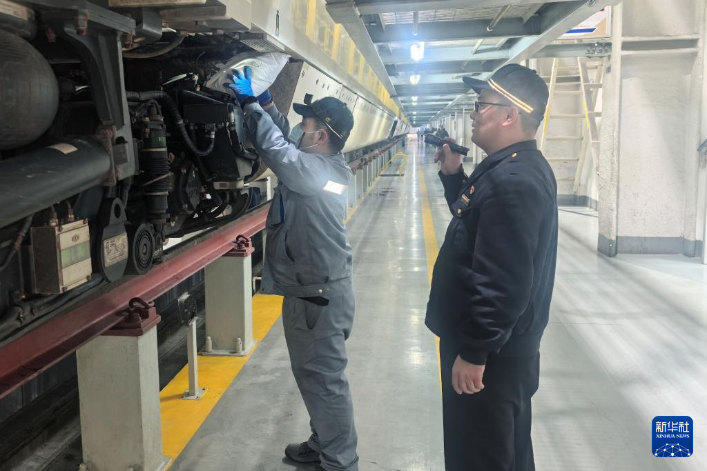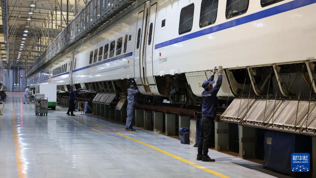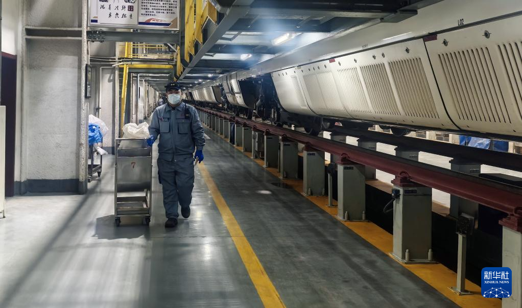 作业完成后,一列复兴号缓缓驶入检修库,车轮和车体还沾着雪泥。不久前载着游子归乡的它,在完成检修后又将载着游子奔赴全国各地。