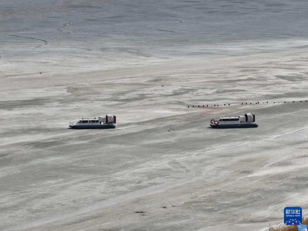 3月2日,两艘气垫船在参加“黄河安澜·2026”防凌实战演练(无人机照片)。新华社记者 张晟 摄