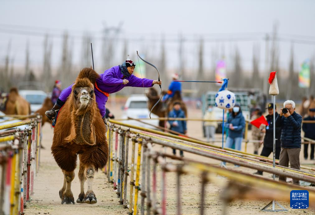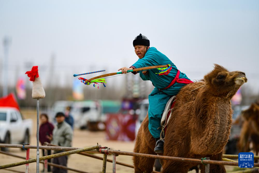 3月8日,弓箭手特木日巴特尔在乘驼射箭比赛中。