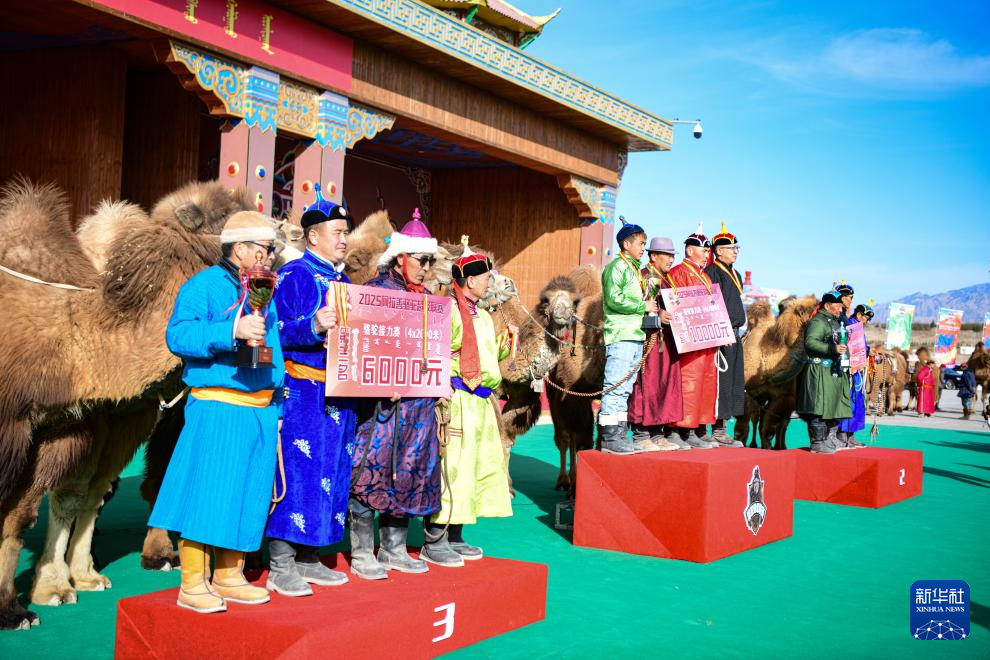 3月8日,获得4×2000米骆驼接力赛前三名的选手在颁奖仪式上。