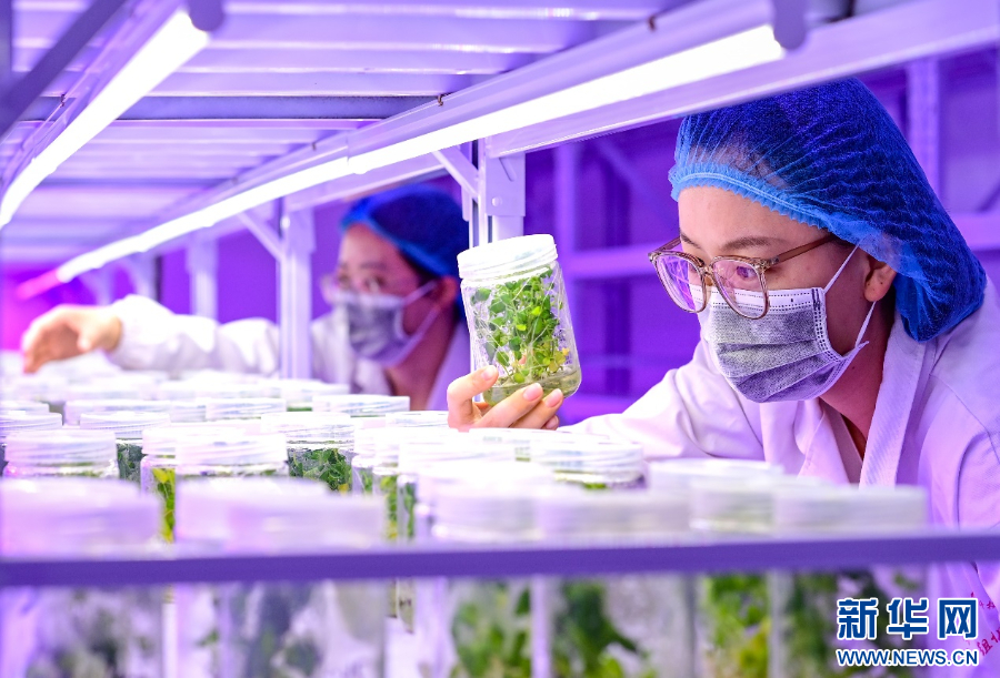 3月18日,科技人员在乌兰察布市农林科学研究院组培中心观察马铃薯新品种脱毒苗生长情况。新华网发(王正 摄)