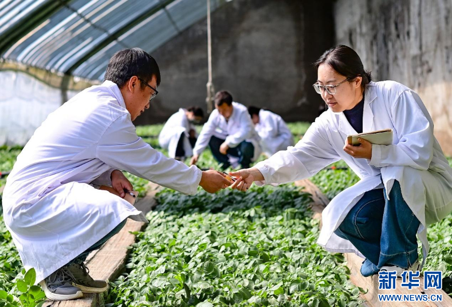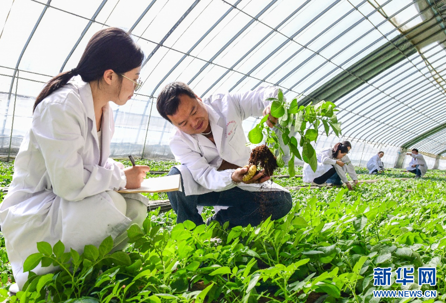 3月18日,科技人员在乌兰察布市农林科学研究院大棚内观察马铃薯新品种原原种生长情况。新华网发(王正 摄)