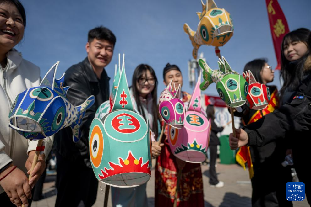 3月20日,呼和浩特黄河开河民俗文化周活动现场,游客手持鱼灯合影。
