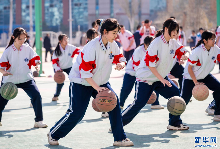 3月25日,呼和浩特市第一中学学生正在上篮球课。新华网发(丁根厚 摄)