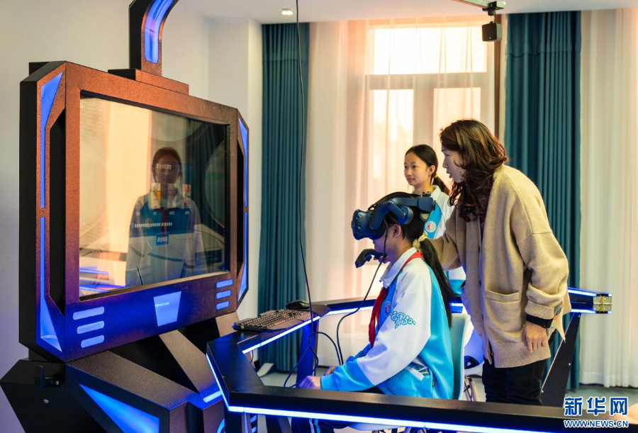 3月25日,中央民族大学附属中学呼和浩特分校学生通过VR设备体验职业模拟。新华网发(丁根厚 摄)