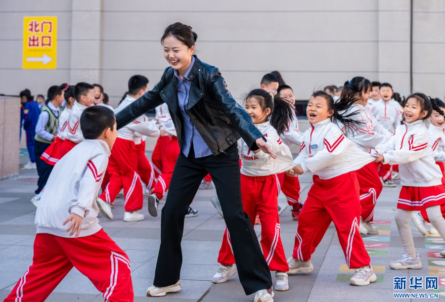 3月25日,呼和浩特市南马路小学新华西街校区师生在15分钟课间玩老鹰捉小鸡游戏。新华网发(丁根厚 摄)